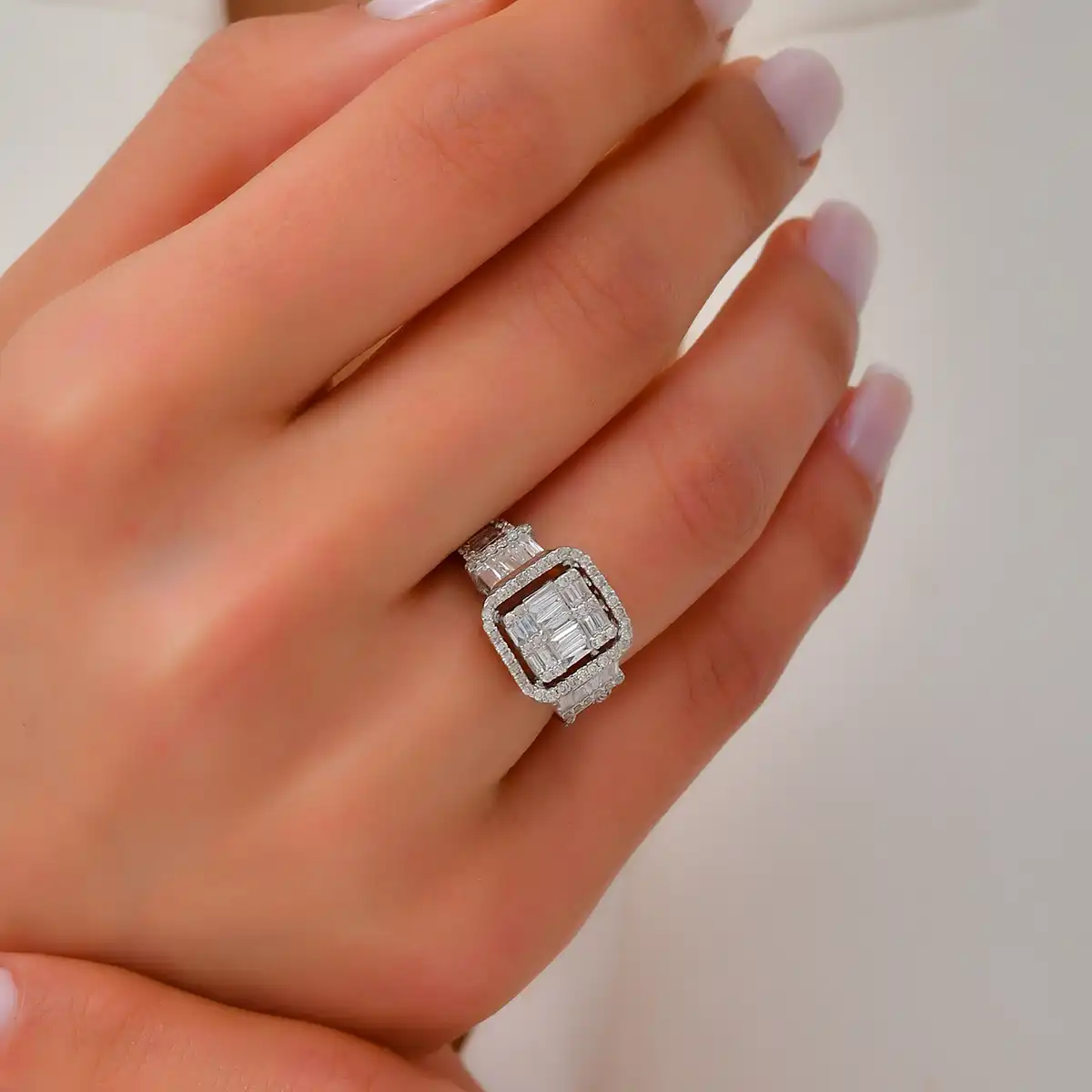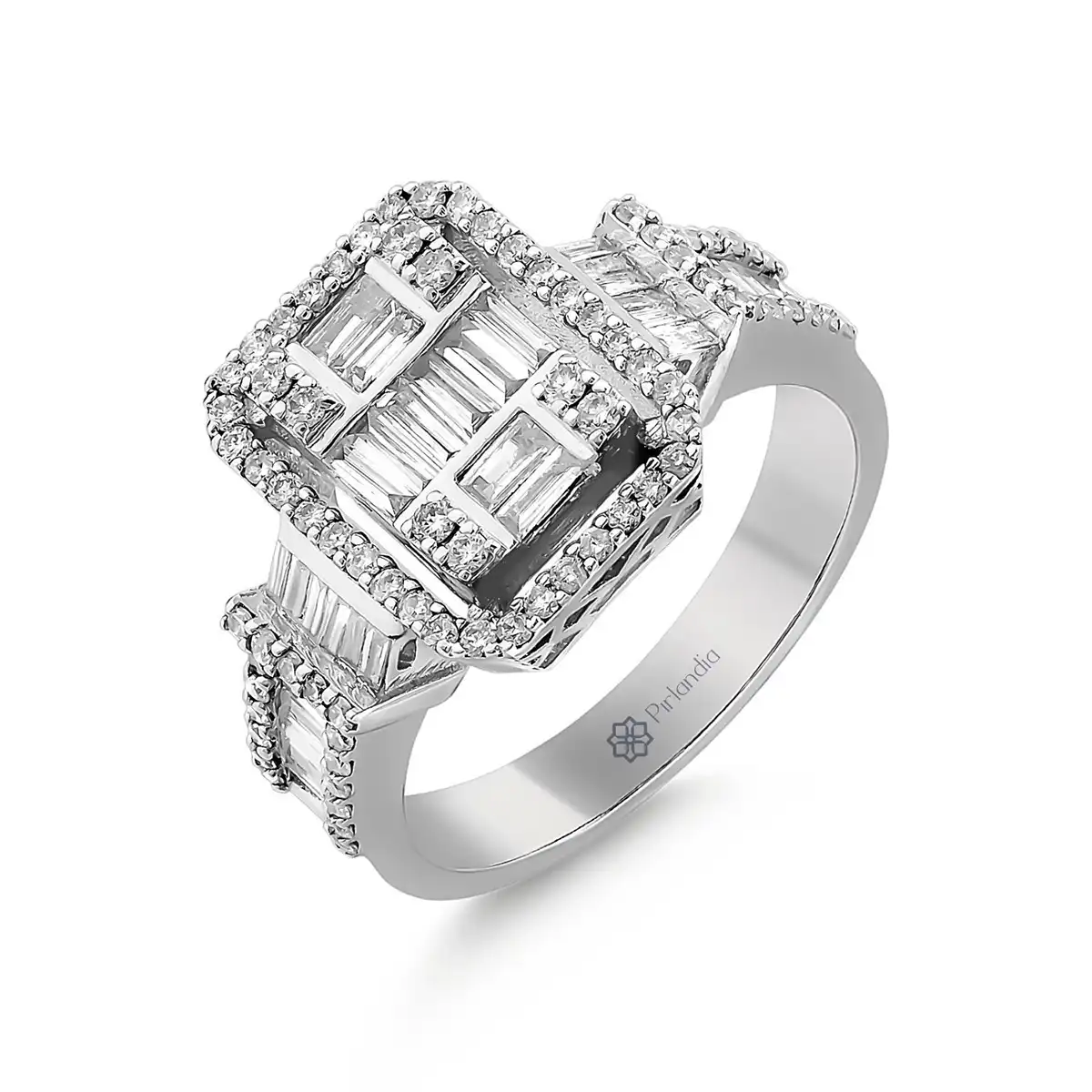 Eşsiz Tasarım: Baget kesim ve yuvarlak pırlantaların birleşimiyle bu yüzük, zarafet ve lüksü bir arada sunar.