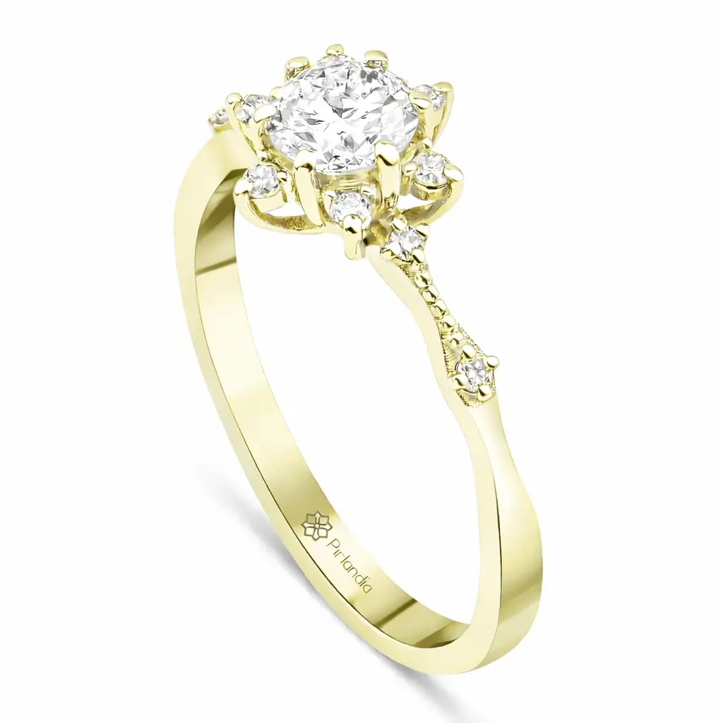 Lotus çiçeğinden ilham alan zarif formu ile tasarlanan bu özel pırlanta yüzük, 0,40 ct HRD uluslararası sertifikalı merkez pırlantası ve etrafını saran 0,12 ct yan pırlanta taşları ile toplam 0,52 ct ışıltı sunar. Yeşil altının klasik ve zamansız tonu, lotus tasarımın simetrik taş dizilimiyle birleşerek yüzüğe dengeli, şık ve göz alıcı bir duruş kazandırır. Hem günlük kullanım hem de özel anlar için ideal bir pırlanta yüzük seçeneğidir.