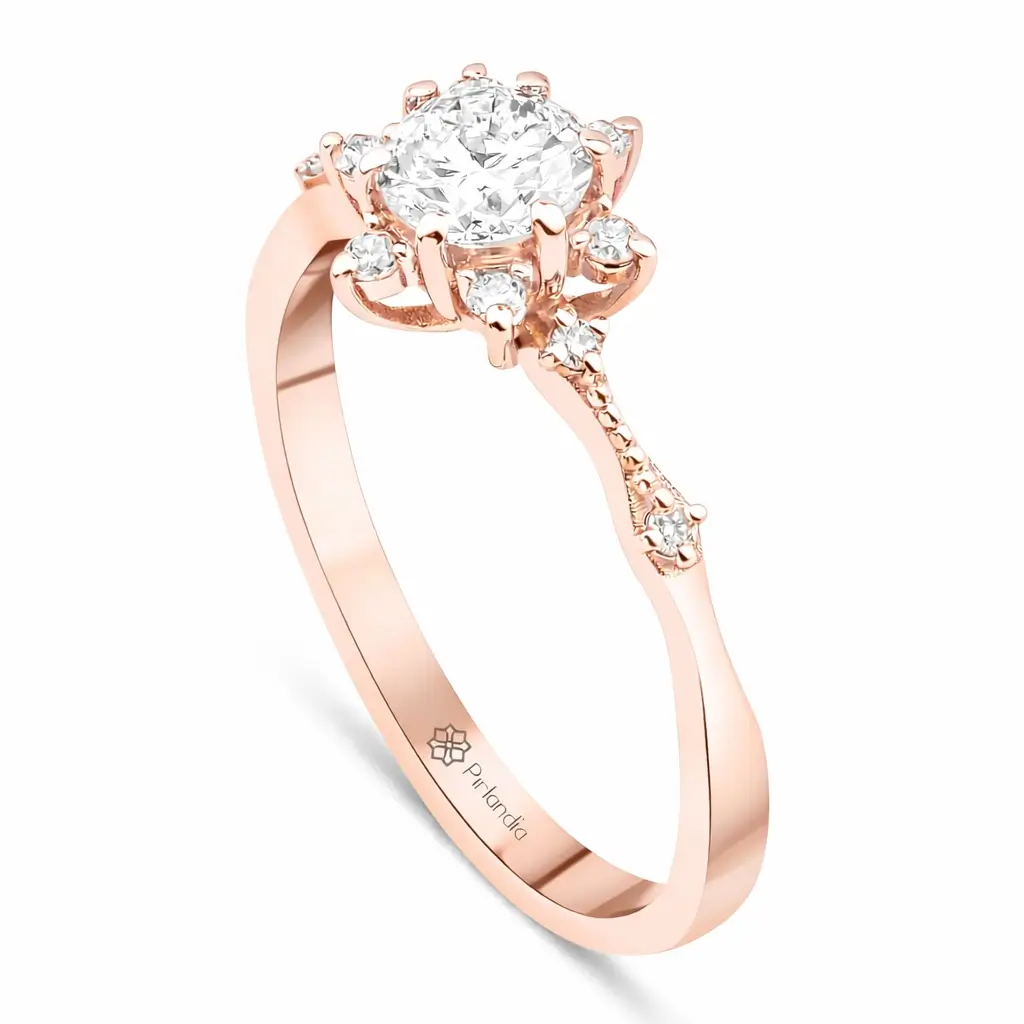 Lotus çiçeğinden ilham alan zarif tasarımıyla öne çıkan bu pırlanta yüzük, 0,50 ct HRD uluslararası sertifikalı merkez pırlantası ve çevresini saran 0,10 ct yan pırlanta taşları ile toplam 0,60 ct etkileyici bir ışıltı sunar. Rose altının sıcak tonu ve lotus formundaki taş yerleşimi, yüzüğe hem romantik hem de dikkat çekici bir karakter kazandırır. Özel günler ve anlamlı anlar için zamansız bir pırlanta yüzük seçeneğidir.