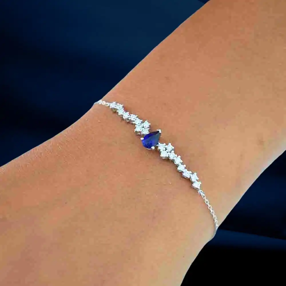 Zarif Tasarım: Ortasında yer alan damla kesim safir ve yanlarında pırlantalarla süslenmiş bu bileklik, eşsiz bir zarafet sunar.