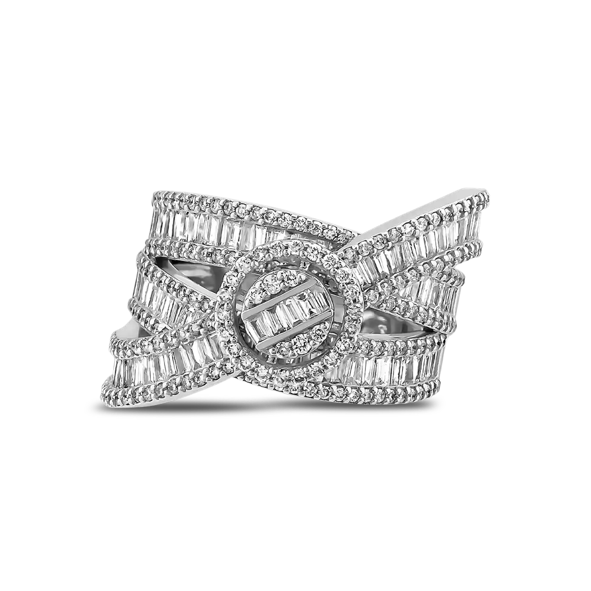 Büyüleyici Tasarım: Ortası klasik baget formunda olan bu yüzük, çevresindeki pırlantalarla birlikte eşsiz bir fantezi tasarım sunar.